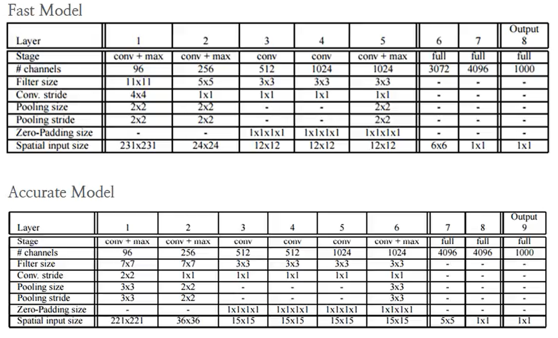 Overfeat는 Fast Model과 Accurate Model로 나눌 수 있다. Fast Model은 AlexNet과 동일하게 5개의 conv layer로 구성되어 있고, Accurate Model은 6개의 conv layer로 Fast Model보다는 속도가 더 걸리지만 정확도를 향상시킨 모델이다.