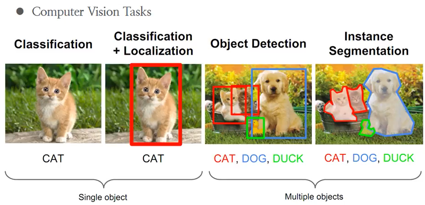 Computer vision Tasks는 크게 4가지로 나눌 수 있다. 이미지상의 하나의 물체에 대해서 어떤 클래스에 속하는지 찾아주는 것을 Classification, classification 뿐만 아니라 물체의 위치정보를 바운딩 박스를 이용해 나타내주는 것을 Localization, 한 이미지 내에서 다양한 물체들의 클래스와 위치를 찾아주는 것을 Object Detection, 이미지 상에서 해당 물체와 배경을 인식해 물체의 영역만을 찾아주는 것을 Instance Segmentation이라고 부른다.