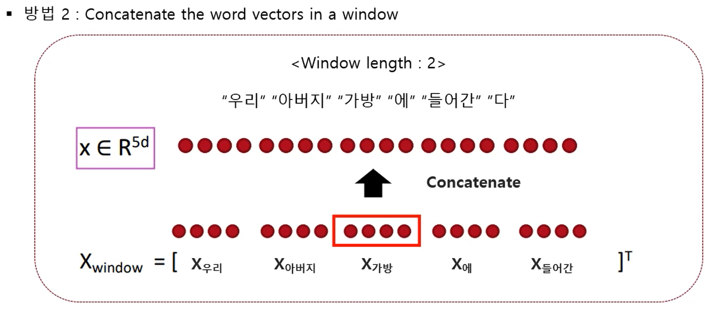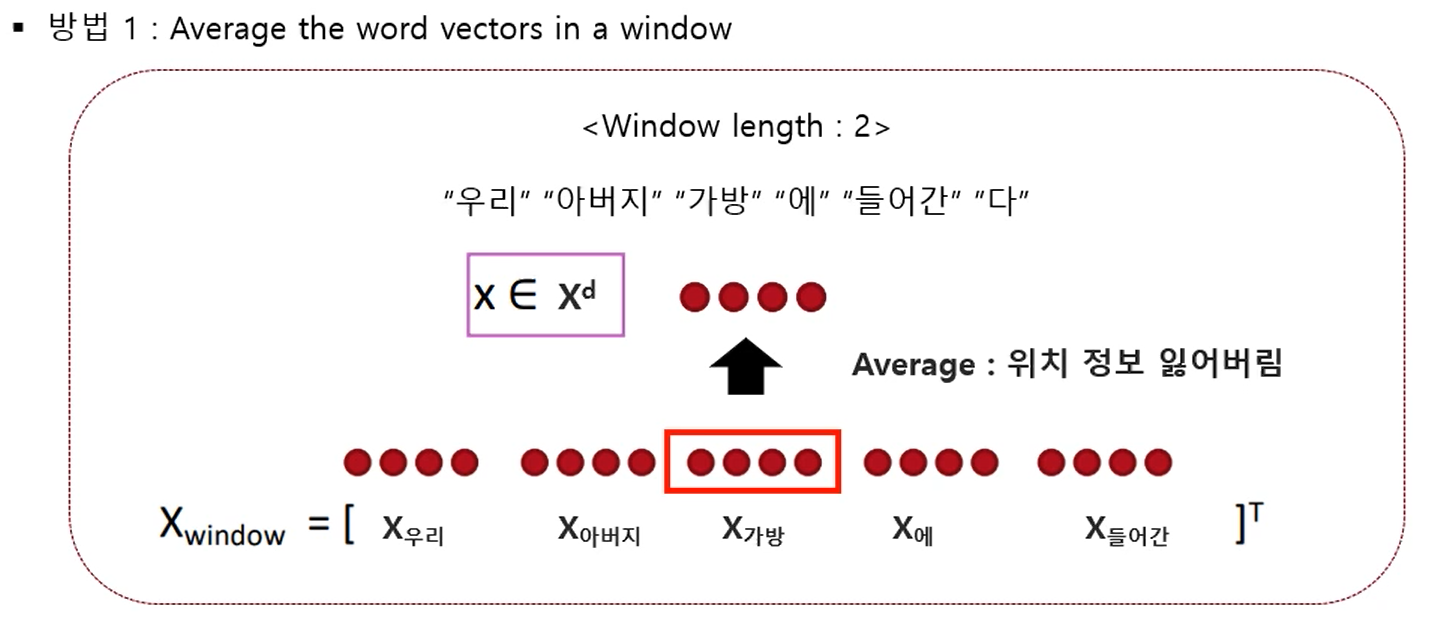 일단 먼저 단어가 4차원의 vector로 임베딩 되었다고 하고, window size는 2로 설정했다. '가방'이라는 단어를 기준으로 양 옆 window size 만큼 단어를 고려한다고 하면, 총 5개의 단어를 고려하게 된다. 4차원으로 된 각각 단어를 합해서 평균을 내주는 Average the word vectors in a window 방식이 있다. 평균을 취해버리는 방식을 사용하게 되면 그 단어가 어디에 위치해있는지에 대한 위치 정보를 잃어버리기 때문에 주의해야한다.