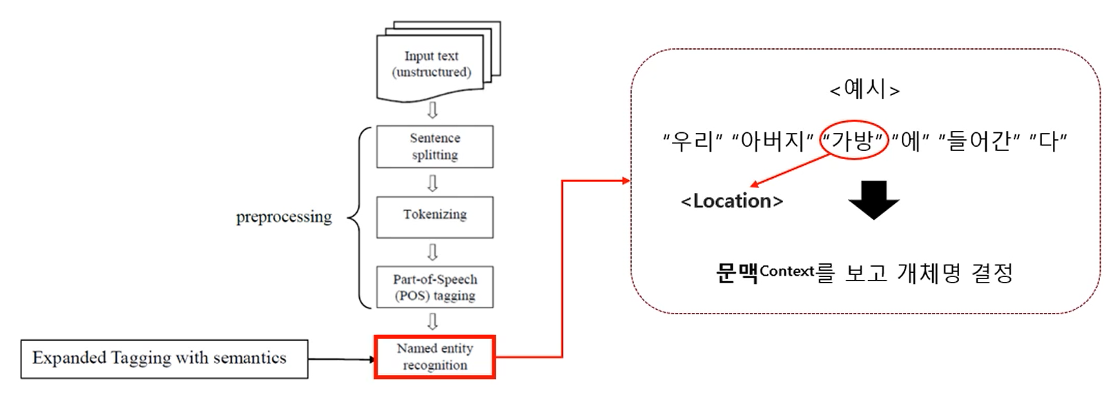 개체명 인식은 문장에서 Location, Person, Organization 등 개체명$^{Named\ Entity}$를 분류하는 방법론이다. 개체명 인식을 하기 위해서는 그 전에 전처리 과정을 해주어야 한다. input으로 text가 들어오면 sentence단위로 split을 해주는 과정이 필요하고, 그 후 tokenizing을 거치고 pos tagging을 해준 후 Named entity recognition을 진행할 수 있다. 아래와 같이 '우리', '아버지', '가방', '에', '들어간', '다' 로 토큰화 되었다고 해보자. 일반적으로 '가방'이라는 단어를 location으로 판단할 수는 없지만 NER에서는 문맥을 보고 결정하기 때문에 아래의 경우 '가방'을 Location으로 개체명을 결정하는 것을 볼 수 있다.