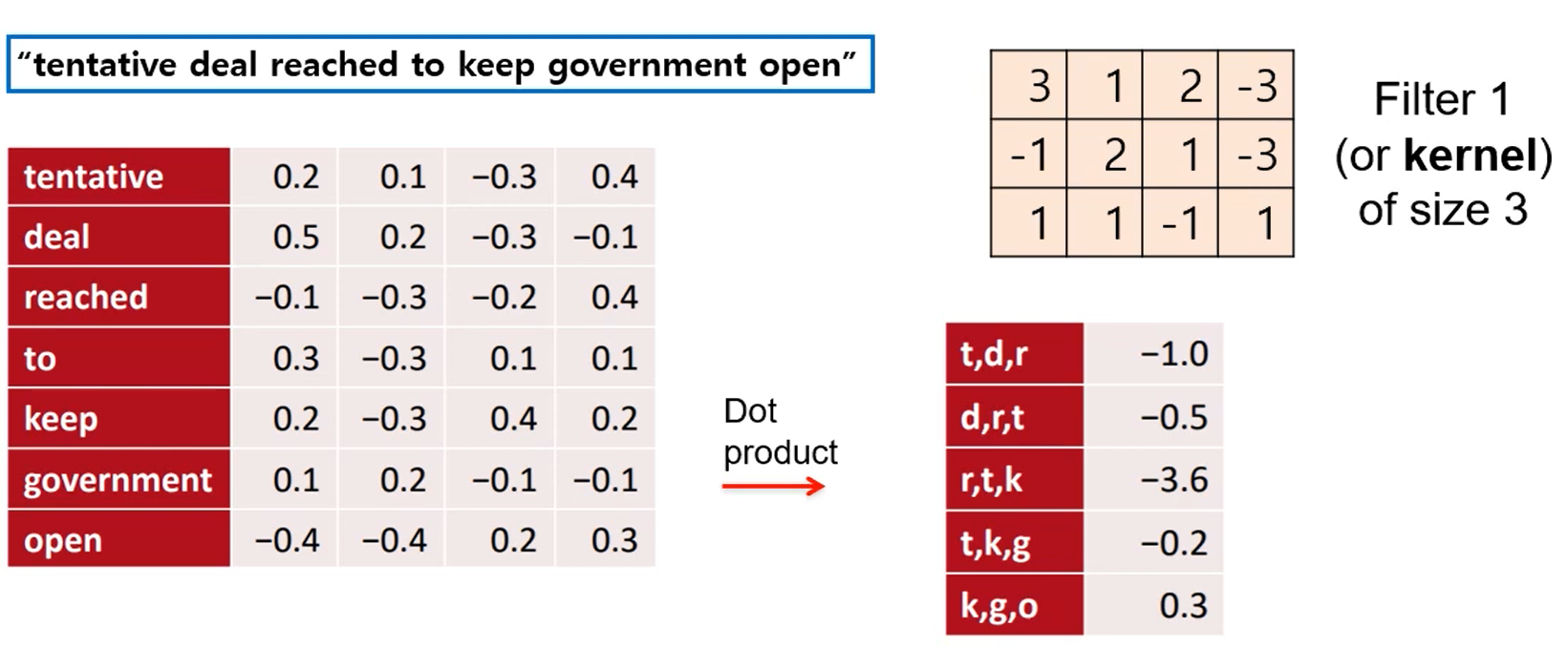 - convolutional filter : $W \in R^{hk}$ ( window size : $h$)