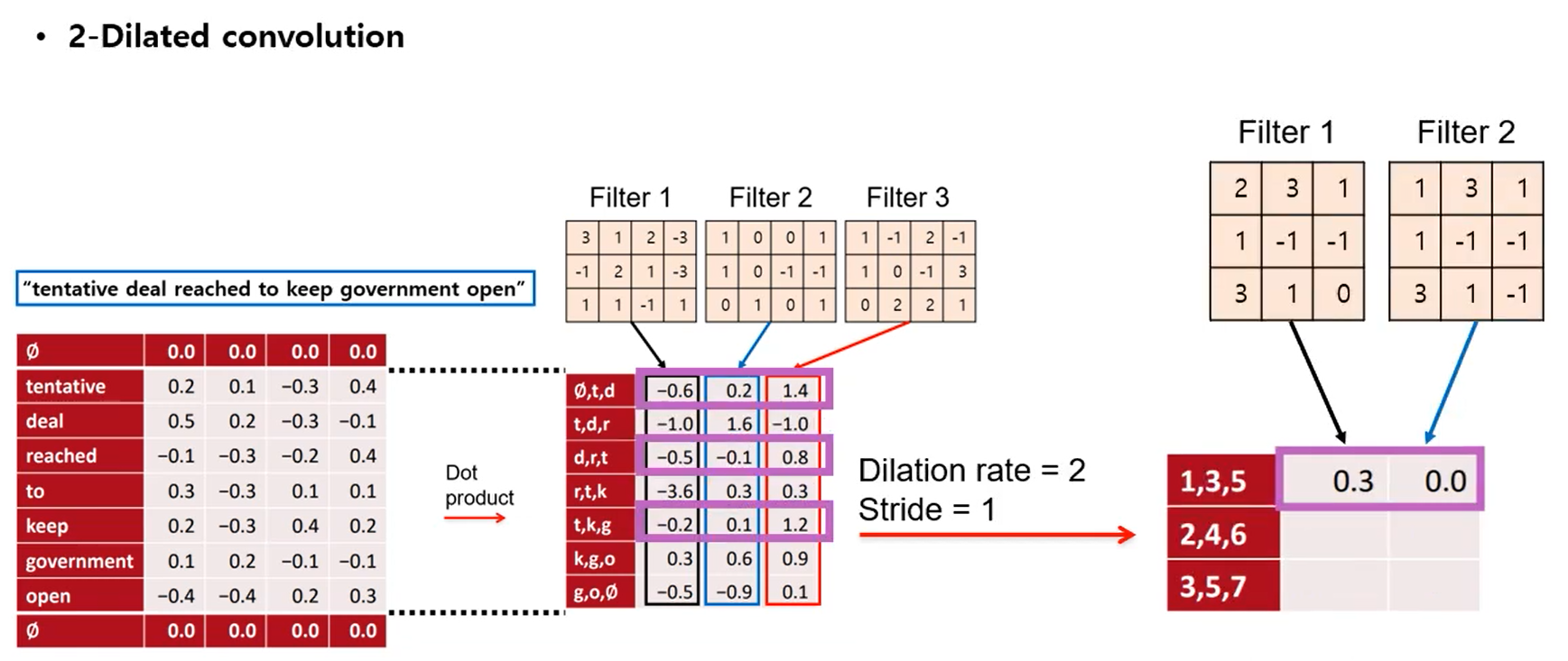 학습되어야할 파라미터들의 Filter가 하나 있다고 가정하자. (size=3) 거기에 맞는 token의 embedding vector가 있다고 가정하면, Filter size의 영역만큼 convolve하게 되며 결과값을 출력하게 된다. NLP에서는 이미지와 달리 한 단어의 정보를 모두 속해야 하기 때문에 한 방향으로 진행할 수 밖에 없다. 그래서 1d Convolution 이라고도 불린다. 해당 단어들을 filter로 계속해서 convolve하면서 stride만큼 이동하며 계산하면 원래의 차원보다 줄어드는 것을 알 수 있다. 이러한 문제를 해결하기 위해 이미지에서 한 zero-padding과 같이 위 아래에 공집합($\phi$)을 넣어 정보 손실을 없앤다. 원래 sequence를 보존하기 위함이다.