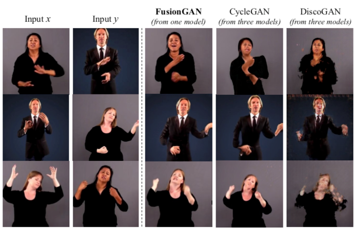 funsionGAN은 바로 이미지 속 특정 객체(identity)의 원하는 모양(shape)으로 만드는 데 집중을 하고 있다. fusionGAN은 최소패치(Min-Patch)라는 새로운 학습 방식을 제안했다. 인간이 이미지를 볼 때 아주 사소한 부분이 이상하면 가짜라고 느낀다는 점을 착안한 것이다. 기존 연구에서 한 이미지를 다른 이미지로 합성하기 위해서는 하나의 생성기를 만들어야 했다. (한 사람을 다른 사람과 shape하려면 사람마다 생성기를 만들어야 했다) 하지만 fusionGAN은 starGAN처럼 하나의 생성기 만으로도 이미지를 합성해낼 수 있다. 아래의 그림을 보ㅕ면 FusionGAN이 CycleGAN, DiscoGAN보다 성능이 더 좋은 것을 확인할 수 있다.