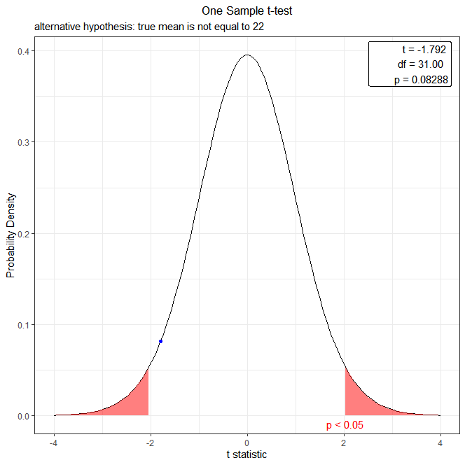 이처럼 t 분포의 가설검정을 하는 방법은 여러가지가 존재한다. 위 경우 신뢰구간을 95%로 설정해서 검정통계량이 2.09가 되었지만 만약 신뢰구간을 99%로 설정하고 싶다면 $t_{0.01,19}$ 를 사용해 2.86을 사용하면 된다.