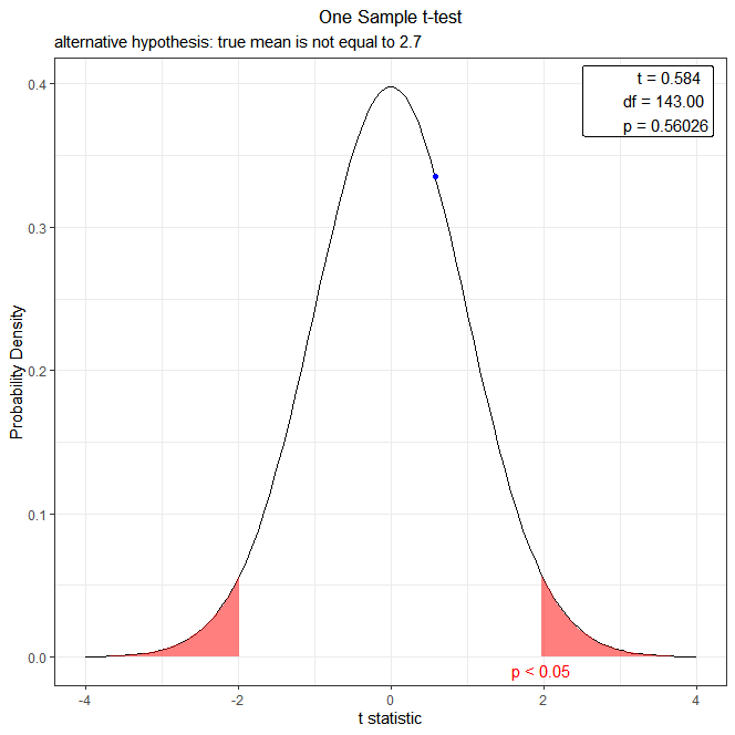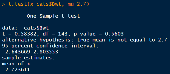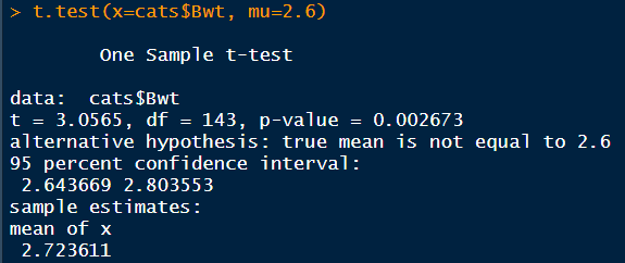 몸무게의 평균이 2.7kg라고 가설을 조정하니 p-value가 0.05보다 커지며 귀무가설을 채택, 대립가설을 기각하게되고 고양이의 평균 몸무게는 2.7kg라는 귀무가설을 만족하게 된다.