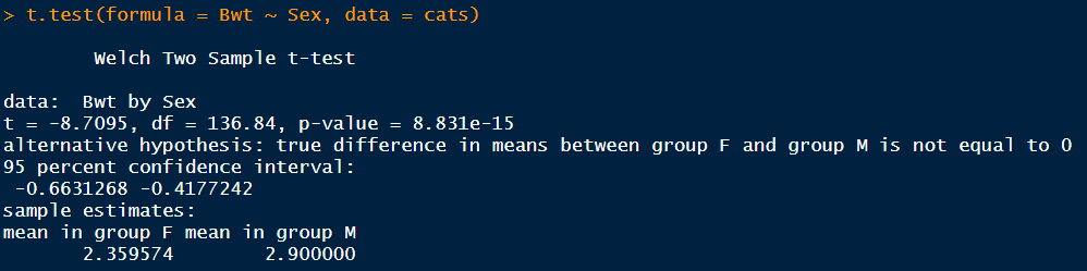p-value가 매우 작은 것을 확인할 수 있다. 따라서 암컷 고양이와 수컷 고양이 두 집단의 몸무게 차이가 없다는 귀무가설을 기각하고, 몸무게가 차이난다는 대립가설을 채택할 수 있다. confidenc interval을 보면 -0.66 ~ 0.41 로 몸무게 차이가 존재하는 것을 확인할 수 있다.