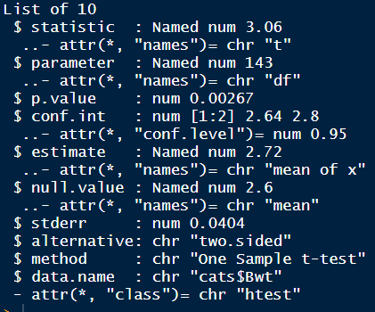 만약 two-side를 하지 않고 크거나 작다라는 가설을 세우고 싶다면 alternative method를 'greater' 또는 'less' 등으로 수정을하면 원하는 결과를 도출할 수 있을 것이다. 추가 상세한 정보를 얻고 싶으면 str(t.test)를 통해 인자를 추출할 수 있다.