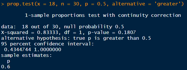 prop.test를 시행한 결과를 보면 p-value가 0.18로 유의확률보다 크기 때문에, 승률이 50%보다 크다고 주장할만한 충분한 증거가 되지 못한다.