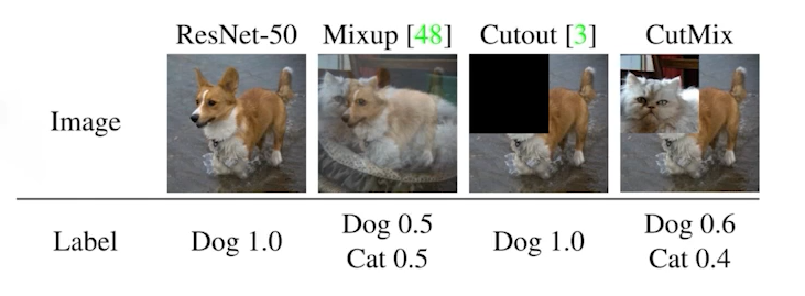 아래의 이미지를 보면 강아지도, 고양이도 아닌 것이 되어버리고 라벨역시 마찬가지다. Cutout은 이미지 하나가 주어지면 일정부분을 짤라버리는 것이고, CutMix는 Mixup와 유사하지만 Mixup처럼 블랜딩하게 이미지를 섞어주는 것이 아니라 이미지의 특정영역에는 고양이, 강아지를 각각 집어넣는 방식이다. Mixup의 경우 주로 사용되며 이 경우 성능이 많이 다이나믹하게 증가한다고 한다. (실험적으로 검증된..)