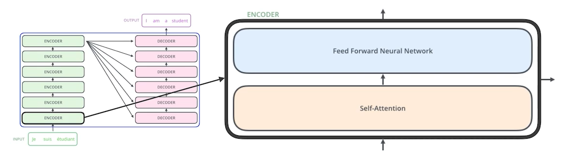 Encoder 하나의 구조를 살펴보면 모든 input Sequencial data를 받아 Self-Attention을 거치고 Feed Forward Neural Network를 거쳐 다음 단의 Encoder의 input으로 들어가게 되며, 여기서 Self-Attention이라는게 이 Transformer가 왜 잘 작동되는지 보여주게 된다.