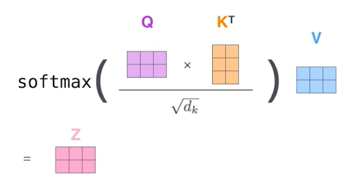 Score를 계산한 다음 key vector의 demenstion의 square root를 취해 나온 값으로 나누어 normalization 해준 후 (논문에서는 key vector를 64차원으로 만들어주었기 때문에 $\sqrt{64}$로 나누어준다.) softmat를 취해준다. 이때 key vector는 hyperparameter로 들어가 score 자체가 너무 커지지 않게 조절해주는 것이라 볼 수 있다.