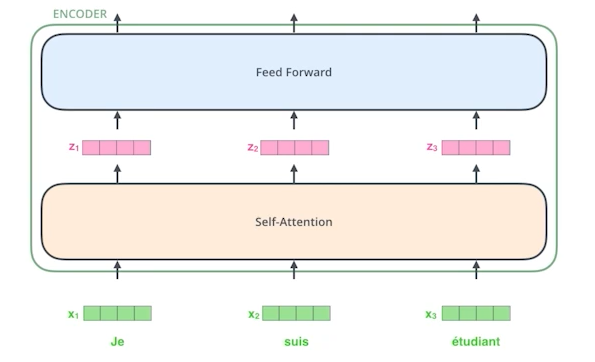 입력으로 3개의 단어가 들어왔다고 가정하면 $x_1, x_2, x_3$ 형태로 각각 단어의 vector를 만들어줄 수 있을 것이다. 그리고 단어들은 Self-Attention을 거쳐서 $z_1, z_2, z_3$로 변환된다. 이 과정이 feed forward와 동일하다고 느낄 수 있지만 가장 큰 차이점은 $x_1$가 Self-Attention을 거치고 $z_1$로 출력될 때 $x_1$하나만 고려하는 것이 아니라 입력되는 Sequence 전체를 고려한다. 즉 $x_1, x_2, x_3$의 정보를 모두 고려해 $z_1$를 만들어 내는 것이다. 이와 동일한 방법으로 $z_1, z_2, z_3$를 만들어내고 그 후 Feed Forward Neural Network를 거쳐 다음 Encoder의 입력으로 들어가게 되는 것이다.