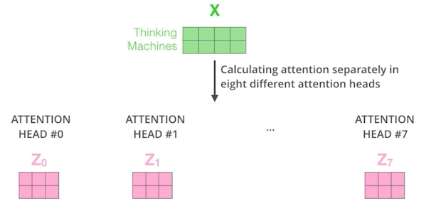MHA는 앞에 있는 Attention을 여러 번 수행하는 것이다. 우리는 Attention을 통해서 하나의 Query, key, value vector를 만든다는 것을 확인했다. MHA는 이러한 Query, key, value vector를 여러개 만드는 것이다. 실제 Transformer에서는 총 8개의 attention이 사용되었다. 이 경우에는 하나의 입력 값이 있으면 총 8개의 embedding vector가 나오게된다.