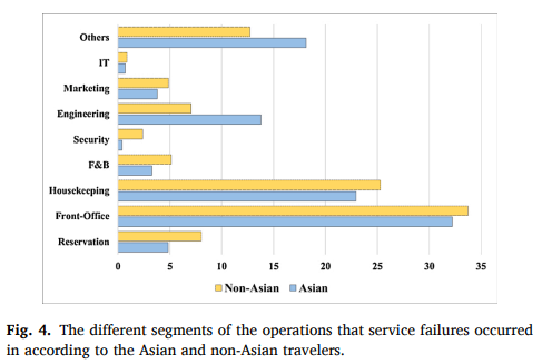 부정적인 리뷰 중 Occupancy 단계가 80%를 차지하는데, 호텔 투숙객은 호텔 시설의 대부분을 Occupancy 단계에서 사용하고 서비스 역시 Occupancy 단계에서 많이 제공을 받기 때문에 더 많은 불만을 느끼는 것으로 확인되고, 아시아인과 비 아시아인 모두 Front-Office에 대해 불만족을 느끼는 경우가 30%를 넘기는 것으로 보아, Front-line 직원의 교육을 통해서 투숙객의 만족도를 어느정도 높일 수 있을 것이다.