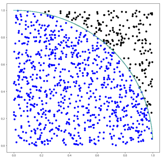 총 천 번 시행하였고, 만약에 원 안에 점이 찍히면 파란색 점을 찍게 설정하고, 원 밖에 점이 찍히면 검정색으로 점을 찍도록 설정해두었다. 만약 시행 횟수를 더 늘린다면 조금더 원주율에 가까운 수식을 산출할 수 있지 않을까 한다. 아무래도 확률값으로 찍다보니 간혹가다가 값이 살짝 이상하게 나올 수도 있지만, 시행횟수를 늘린다면 근접한 값이 나올 것이다. 퍼뮤테이션 방법 중 하나인 몬테카를로 샘플링을 다루어 보았다.