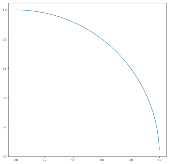 x는 0부터 1까지 0.001 간격으로 점을 찍었고, y의 경우 원방정식 ($ r^2 = x^2 + y^2$)으로 유도하여 y를 계산했다 이때 반지름은 1로 계산하였다.(반지름이 1이 아니라 다른 수로 설정하여 본인 입맛대로 해보는 것도 좋은 공부가 된다.)